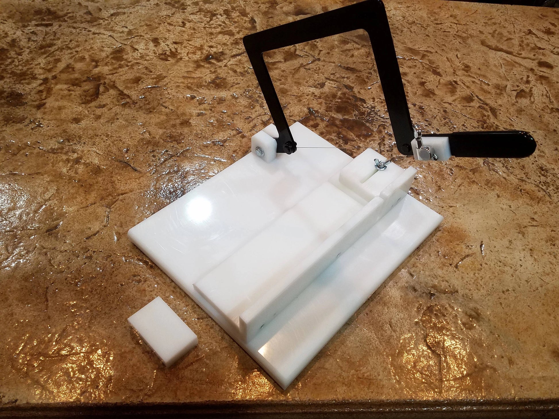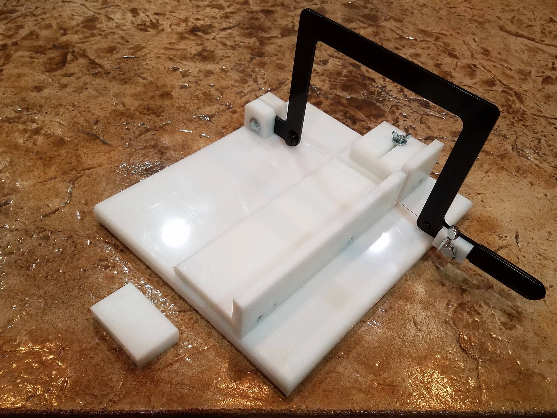 This is an adjustable single wire soap cutter that adjusts from 0-2". It will cut a loaf 5" tall x 5" wide x any length. A loaf support is included for cutting longer loaves. It is made from black powder coated metal and high-density polyethylene plastic. It measures 14"x12"x9". This cutter is custom made to order.